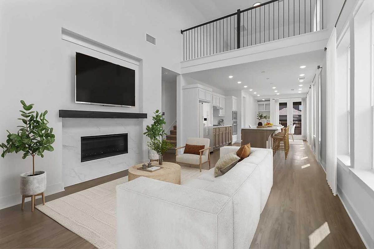 This 1.5 story home plan has a great extra bed-living space on the second floor for guests. Extended covered patio for outdoor fun and the great room has soaring ceilings open to the second level and features a family room with cozy fireplace, kitchen and dining, making it an excellent space for entertaining. The primary suite features an oversized shower, double sinks and an enormous closet. Two more bedrooms round out the first floor with plenty of private space for everyone!